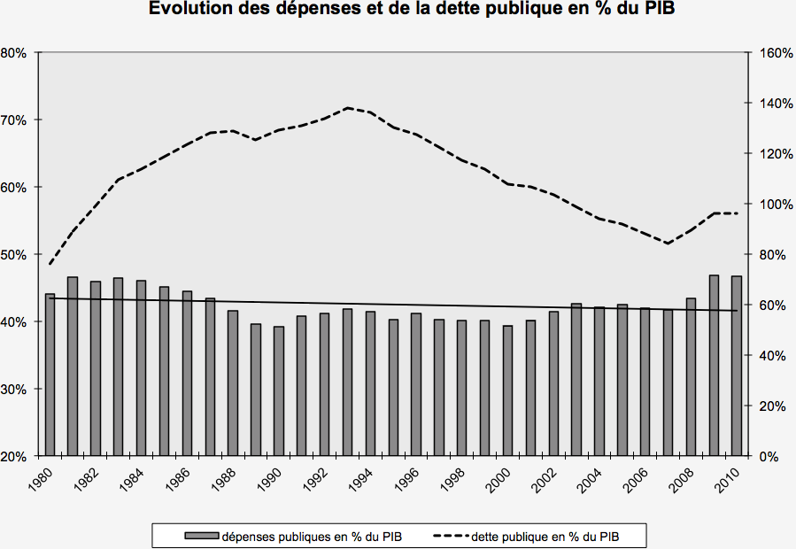 - En Belgique, la part des d�penses publiques dans le produit int�rieur brut (PIB : la richesse nationale) est quasiment stable depuis les ann�es 80, tournant en moyenne autour de 43% (Sce : Banque Nationale de Belgique)